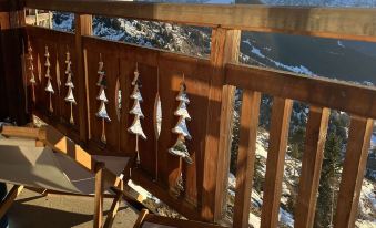 * Living Room: Our living room is equipped with comfortable sofas, perfect for relaxing or watching a movie. The large window offers a magnificent view of the snowy mountains, adding a magical touch to your evenings.
