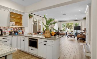 ** Step into an open and thoughtfully designed floor plan that greets you with a bright and inviting living area, filled with natural light to create a cozy atmosphere. Enjoy the combination of a living and dining room, complete with a charming breakfast nook and a family room perfect for gatherings. The large gourmet kitchen is truly a chef's paradise, boasting modern Thermador Pro appliances and all the essentials you need. - You'll find a spacious 42-inch side-by-side refrigerator, a lovely farm sink, a U-Line wine refrigerator, and gorgeous granite slab countertops.