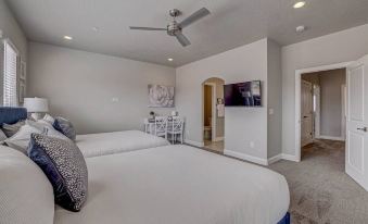 The gorgeous 4 bedroom 3.5 bath home can sleep as many as 15 people or 19 with the use of two pillow top blow up double sized mattresses. Every bedroom and living room has smart tv's. Two master bedrooms with a jack and jill bathroom attached to the other two rooms. One living room and master down stairs and a large living room loft upstairs with an upstairs patio and an amazing outdoor patio with the hot tub, putting green and grill. Two blow up paddle boards for your use in the many outdoor trails and lakes. Xbox, ping pong table, pop a shot, and basketballs and pickle ball sets for the courts next door.