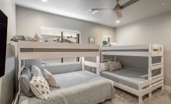 Bedroom #3 is where the kiddos can have a blast. It features 2 twin over queen bunk beds, with a twin trundle mattress under one of the queens. There is a twin mattress in the closet as well to put on the floor for an additional bed if needed. This room can sleep 8 comfortably on the six mattresses (2 queen bunks and two twins on the tops with two additional floor twin mattresses).