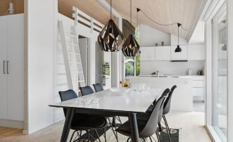 Single-family house, built in 2022. 200 m from the sea. Private: natural state property 1'190 m2. Barbecue, children's playground (slide, swing). In the house: washing machine. Parking at the house. Grocery 1 km. Golf course 3.4 km. The owner does not accept any youth groups. "Elin" - 200m from the sea", 3-room house 102 m2. Object suitable for 6 adults. Living room with TV. 1 room with 1 double bed. 1 room with 1 double bed. 1 room with 2 beds. Kitchen (oven, dishwasher, 4 ceramic glass hob hotplates, microwave, freezer). 2 showers/WC, hydro massage bath. Facilities: Internet (WiFi). Please note: non-smokers only. Bookings accepted for holiday purposes only. 376-28402