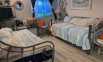 This large condo unit (1275 Sq feet) has ample space for lounging in the common areas as well as large bedrooms, each with flat screen TVs and internet. Pay-per-view orders are available at an additional charge. The kitchen is fully equipped with everything you need. There is a brand new washer and dryer in the unit for your use. The master suite has a California King bed, walk-in closet, twin sinks, a large extra-deep bathtub with separate shower and toilet room. The 2nd bedroom has two twins and a pull out bed. There are air beds for extra guests to set up in the living room, where three or more adults can comfortably sleep, listening to the waves outside.