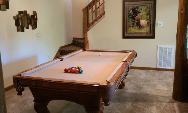 The walk out lower level has a large common area in the center of two bedrooms, each bedroom has its own bathroom, 32' TV, Cable and DVD player. There is a 42' TV, DVD player, DVD library, game table, board games, Wii game and oak pool table.