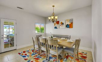 Enter this vacation home and step into a spacious living room seamlessly connected to a family kitchen. The living room provides ample space for relaxation in front of a 70-inch Samsung 4K Smart television. Enjoy the ambiance created by the Textured Quartzite Stone wall behind the TV, many can lights, and abundant natural lighting. Adjacent to the living area, the casual dining room features a dining table accommodating eight guests. The fully-equipped kitchen boasts stunning stainless steel appliances, including a French door refrigerator with a water and ice dispenser. Granite countertops make for easy clean up, while bar-height seating for two adds to the convenience of savoring a fresh meal. Please note that spices, condiments, and oils are not provided.
