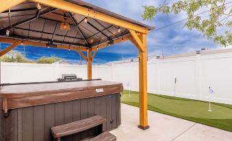 Our home offers a king suite, a queen bedroom with a bathroom around the corner, and a pullout bed too. Each bed has a top of the line mattress for your comfort. Each bedroom, as well as the living room, is equipped with a smart TV for nights you just want to stay in. But if you’re in the mood to be outside, we have a Calospa hot tub (covered), an outside bar & fire table, and even a putting green for activities. We have provided a grill with grill accessories, and have all the utensils you need to cook at home.