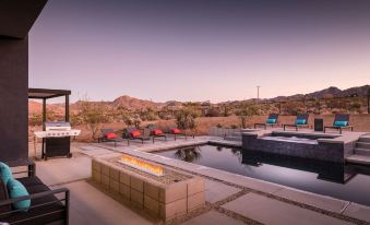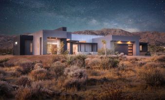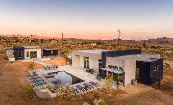 Experience desert Luxury at its finest. This custom built property is located near the National Park entrance. It features sleek contemporary design, high ceilings, and an open concept living / dining / kitchen with sweeping views of the Joshua Tree mountains visible through its floor to ceiling windows and high ceilings. The main house features 3 bedrooms and 2 bathrooms. The detached casita features 2 bedrooms, 2 baths, a full kitchen, and a living area. Venture outside and explore the desert-scaped property complete with custom (non-heated) pool and spa as well as a custom fire pit. There is a large outdoor dining area and multiple seating and lounging areas. Adding to the property's appeal is its convenient location near the Joshua Tree National Park entrance and downtown Joshua Tree.