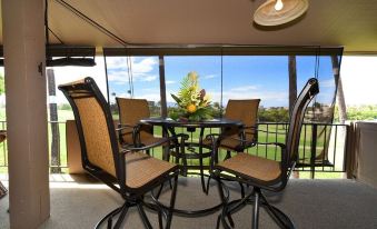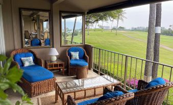 Recently updated with quartz counters and stainless appliances, the kitchen is well-stocked with new dishes and glassware plus a variety of small appliances not always available at vacation rentals. The spacious living room and dining area look out to ocean and island of Lanai. Whether preparing meals or enjoying some takeout, from the kitchen to lanai, it's relaxing and private to look out to the golf course and island vistas. A fold-out queen bed offers an additional sleeping area if needed plus the sofa itself is comfortable compared to many sofa sleepers!