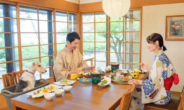 湯快わんわんリゾートの中では趣が違う老舗旅館でした(他所は行った事ありませんが・・・) スタンダード和モダンに宿泊です。 スタンダード故に広い部屋ではありませんでしたが、不自由ではありませんでしたよ。 夕食の会席料理は素晴らしく美味しく頂きました、同伴のワンコにもワンコ用の会席を与えましたが見栄えも良く満足でした。 次回は、露天風呂付きの部屋に泊まりたいです。 一つ注意点が、大浴場にある露天風呂の床ですが 注滑るので注意と書いてありますが注意してもよく滑るので利用の際は十分に気を付けましょう