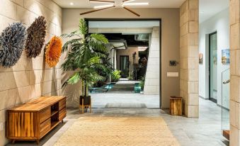 As you enter through the lush courtyard, you’ll be captivated by the sight of a saltwater pond that reflects the vibrant Hawaiian landscape. The path meanders past a soothing water feature, the soft sound of trickling water welcoming you to the heart of the home. The fragrance of tropical blooms fills the air as the natural beauty of Hawaii envelops you. The courtyard connects the main house to a private detached guest suite, ensuring peace and privacy for all.
