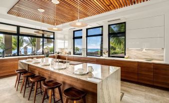 Inside, the gourmet kitchen is equipped with top-tier Miele appliances, a built-in coffee maker, and a temperature-controlled wine storage system, ensuring your culinary and beverage needs are met with ease. With multiple refrigerator drawers and a walk-in pantry, there’s ample space for stocking everything from gourmet ingredients to local Hawaiian delicacies.