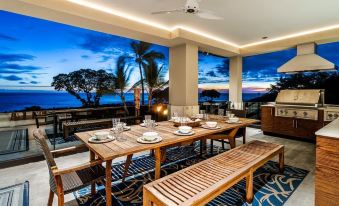 The expansive mosaic tile saltwater pool, surrounded by Tucci umbrellas, beckons you to relax under the sun or take a refreshing dip while enjoying uninterrupted ocean views. Whether you’re sipping Kona coffee as the sun rises or unwinding with a sunset cocktail, the lanai and pool area will be your favorite spots to embrace island living at its finest.