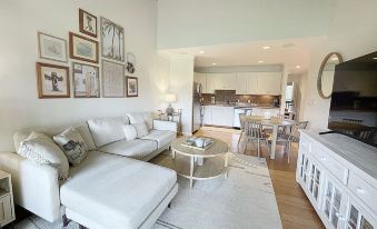 This open concept space allows the dining and living areas to combine at times. After a fun day living your best life in paradise, you can curl up on the comfy L shape microfiber couch and read a book, or watch a show on a 65" Smart TV. If you want to try and work on some bonding time, look in the tv console middle drawer for games to play together!