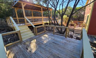 With it's high elevation and unique design, Hilltop Cabin is the most unique home you will find in the Guadalupe South Fork area. Where else can you find such a charming home with expansive views, wooded privacy and private river access? What more could you ask for? The Cabin is loaded with both hill country charm, and modern amenities. This is a full size home that leaves nothing to be desired, while providing the charm and fun of a rustic Texas hill country cabin. There are 3 bedrooms, all with queen beds, and each with its own full bathroom, comfortably sleeping a total of 6 adults. There is also a full sleeping sofa and several blow up mattresses and a half bath downstairs for additional sleeping arrangements for several children. The kitchen and dining areas are very large, which make for great meal prepping and gathering for large groups. The laundry room is what you would expect to find in a larger home, with a full size washer and dryer. The main living space is large enough for a big gathering with plenty of places for everyone to gather around the wood burning fireplace. We keep the house well stocked with toiletries including wet wipes, toilet paper as well as shampoo, conditioner and his and hers body washes for your convenience. Outdoor living spaces include multiple options for sun and shade as needed. A large porch sits off of the main living space with rocking chairs and ceiling fans. From this porch you can step down to a large outdoor gathering area with plenty of seating and a fire pit. We have extensive decking in the back of the house with seating right off of the dining area, upper decking with two picnic tables under cover , as well as a large charcoal barbecue pit for outdoor grilling. There is a wrap around porch along the front and side of the house with chairs and a bench swing to take in the hilltop views across the Guadalupe River Valley. There are also several sitting areas around the 2.5 acres for enjoying the many different areas of the secluded and private property. Although the property is not riverfront, the private river park is a quick 3-5 minute walk from the front door (we've timed it). You can also access the park via a shorter drive for anyone that has mobility issues. The River Inn Crossing section of the Guadalupe is at the headwaters of the south fork, giving you the cleanest, clearest water that the river has to offer. The depth and width of the river in this section is perfect for all water activities. Many other sections of the river are either too shallow for swimming and canoeing, or too narrow for real exploring. An added bonus this far up the river is the clarity of the water. On a typical day, the water is virtually as clear as a swimming pool. This is one of the only locations on the Guadalupe where snorkeling is a real option, so don't let the kids forget their goggles. Parents won't have to worry about the little ones, because you can see straight to the bottom, and the average depth in front of the park is about 3.5 feet. There is also a very neat section where you can get out of the kayaks and walk around and explore the shallow channels and pools (probably our kids favorite spot). Although the cabin is far enough out that you have true privacy, serenity and quiet, it is a perfect home base for hitting all of the different places that people like to go. You can make a quick and very picturesque 25 min drive over to Vanderpool for a couple of hours of hiking or picnicking at Lost Maples State Park. You can head over to Fredericksburg, which is only 20 minutes from Kerrville, and spend a few hours shopping or antiquing. Maybe you want to go horseback riding or fishing in another location. Maybe you are a motorcyclist and want to hit the infamous Twisted Sisters which are very close to Hwy 39.. Then again, maybe you just want to hang at the river and cabin, and get a full weekend of relaxation in, while the kids wear themselves out with all the fun and activities. The great thing about staying at the cabin, is that the activities are endless and are all right at your fingertips. You may also enjoy the various type of wildlife around the cabin and area. Axis and whitetail deer, raccoons, ringtails, opossums, skunk, porcupines, foxes, bobcats, turkey, roadrunners, javelina, armadillo, rabbits and all types of birds etc.