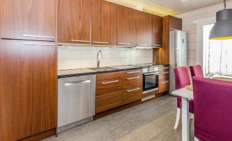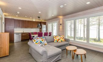 95km south of the city of Joensuu with the lake Puruvesi located 20 m away (416,35 km²). The lake has a shallow sand floor suitable for children. A shared beach, boat and pier are available for use. The holiday villa made from planed log in 2015 includes a spacious kitchen and 2 bedrooms each with 2 beds. The living room is equipped with a convertible sofa. A laundry room, electric sauna and a large partially furnished terrace. A travel cot for toddlers and an attachable high chair will be delivered to the cottage when reserved in advance. A modern, well-lit and spacious villa opens up to a beautiful view to the lake Puruvesi. The villa locates by the lake in the Karelia Country Club holiday centre which has a combined 8 holiday cottages and 2 beach saunas. A wireless internet connection, beach sauna, grill shelter with a smoke grill, 2 wilderness lodges, a volleyball and petanque court, 2 boats and a pier are all available for customer use.