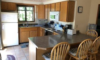 There is a well appointed, outfitted kitchen with staples and condiments stocked prior to your arrival. The kitchen has a refrigerator, microwave, electric stove/oven coffee maker, toaster, crock pot, deep fryer and more.