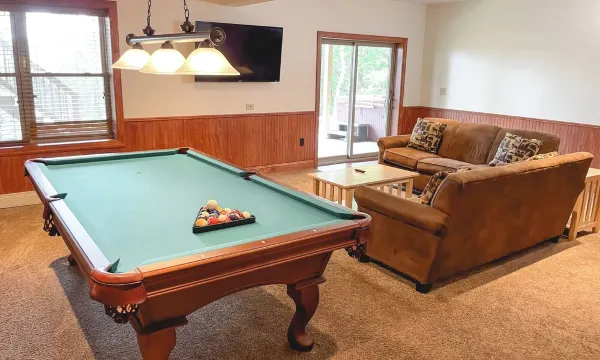 Cabin-style finishes, and mountain-inspired décor create a warm yet sophisticated ambiance, seamlessly blending rustic charm with modern comfort. Entertainment options are aplenty with two 75” Smart TVs, an indoor/outdoor fireplace, a lower-level game room, an 8’ pool table, and a full-sized arcade machine packed with your favorites such as Ms Pac Man, Donkey Kong, Frogger & more!