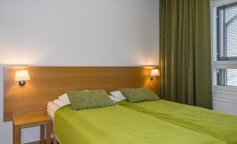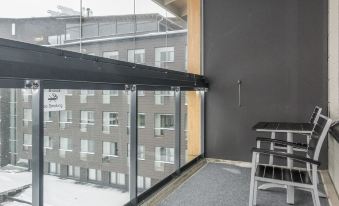 The apartment features an open kitchen, a bedroom with two beds, and a bunk bed in the alcove, with the lower bed being 120 cm wide. Sauna, a shower room, a separate WC, and a glazed balcony. Moreover, the bedroom is equipped with a workspace.