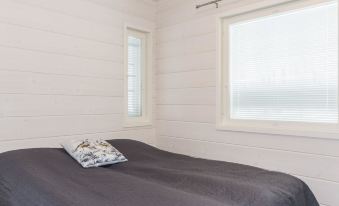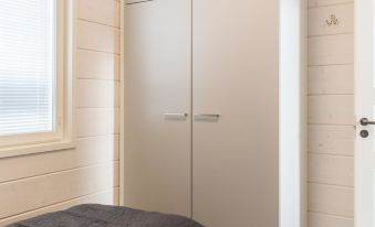 Facilities on two floors. On the ground floor, living room/kitchen, bedroom with two beds, sauna, washroom and WC. On the upper floor, 2 bedrooms, both with 2 beds, living area with sofa bed, WC and balcony. Child gate on the stairs both on the upper floor and on the ground floor. Open terrace.