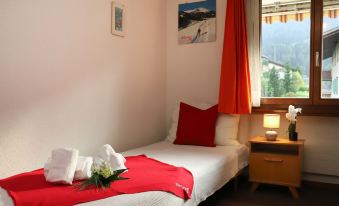 Klosters: Child friendly, cosy, rustic apartment house "Casa Parnier", 1'205 m a.s.l.. On the outskirts, 1.2 km from the centre of Klosters Platz, in a quiet, sunny position, 700 m from the skiing area. For shared use: garden with lawn. In the house: storage room for skis, central heating system, washing machine, tumble dryer (for shared use). Room cleaning on request (extra). 4x4 car recommended in winter. Single garage at the house. Supermarket 700 m, restaurant 100 m, bus stop 50 m, railway station "Klosters Dorf" 600 m, outdoor swimming pool 1.5 km. Golf course (18 hole) 3.1 km, tennis 500 m, indoor tennis centre 1.2 km, minigolf 350 m, sports centre 1.2 km, mountain railway 700 m, ski school 30 m. Well-known ski regions can easily be reached: Madrisa 700 m, Parsenn 1.2 km. Well-known lakes can easily be reached: Davosersee 13 km. Object suitable for 5 adults. Please note: Loading and unloading of baggage is possible at the holiday house. "Parnier", 4-room apartment 110 m2 on 1st floor, south-west facing position. Object suitable for 5 adults. Spacious, rustic and cosy furnishings: living/dining room with open-hearth fireplace, separate WC, cable TV and international TV channels (flat screen). Exit to the balcony. 1 double bedroom with 1 double bed (2 x 90 cm, length 200 cm). 1 double bedroom with 2 beds (90 cm, length 200 cm). 1 room with 1 bed (90 cm, length 200 cm). Kitchen-/living room (oven, dishwasher, 4 ceramic glass hob hotplates, microwave, electric coffee machine, Capsules for coffee machine (Filterkaffee)) with small bar, dining table. Sep. WC, bath/shower/WC. Heating. Carpet. Large balcony. Balcony furniture. Beautiful view of the mountains and the countryside. Facilities: Internet (DSL/LAN, free). Garage on the property (1 car). Please note: suitable for families. Non-smokers only. Maximum 1 pet/ dog allowed.