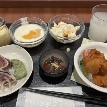 사람이 많고, JR 역에서 거리가 좀 있다는 점을 제외하면 전부 장점뿐입니다. 고치성에서 가깝고, 노면전차 타기 편하고, 밤에는 상점가에서 산책할 수 있고, 야식으로 소바도 먹을 수 있고, 천연 온천 '딥 블루 온천', 야쿠르트, 그리고 푸짐한 아침 식사까지 제공됩니다.