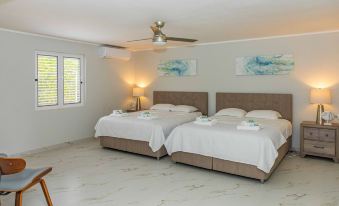 The property was better than expected. The only complaint is that our vacation days ended and we had to go home. All the rooms were very spacious and nicely done. The upstairs area was another complete living area with kitchen, dining, living, master suite areas. There was a nice cross breeze upstairs and downstairs that kept everything cool. Rinse tank and hanging area for dive gear were right by the parking area. The pool and views were spectacular. So nice to float, watch the sunset and the parrots fly overhead. Amazing. This is the best place we have stayed in all of our trips to Bonaire. Quiet neighborhood away from the busy main roads. No reason to look anywhere else.