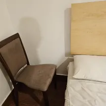 침대 한쪽에 침대 옆 탁자가 없어서 의자를 침대 옆 탁자로 사용해야 합니다.