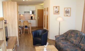 The comfortable living area is furnished with a sofa bed and comfortable armchairs. After an eventful day, put your feet up here, relax or let the day fade away on the balcony. You can enter this directly from the living area. A flatscreen TV with cable, radio and CD player complete the entertainment.