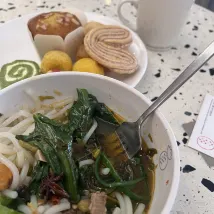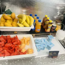 뷔페식 조식은 쌀국수, 쌀국수 롤, 다양한 작은 케이크, 튀긴 반죽 스틱, 두유, 수박, 망고 요거트 등 매우 풍부합니다.