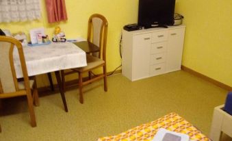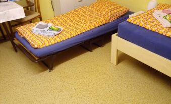 In the room there are two beds (0.9x2m), as well as two bedside tables, a television (satellite TV), a table (is partly used for various kitchen appliances, but there is enough space to eat etc.) with 2 chairs and a chest of drawers . The two beds can of course be put together or pushed apart. You decide, or make yourself as comfortable as possible. The apartment is covered with WiFi.