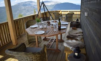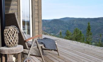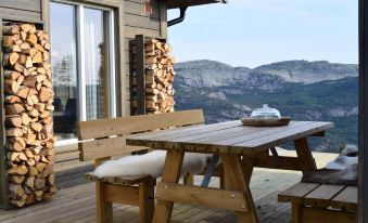 The following elements will be there: open living area, fitted kitchen, dining area with kitchen sofa, wood-burning stove, comfortable seating on floor-to-ceiling windows that offer a wonderful panoramic view of the mountains as well as two large lakes and the small village of Vradal. Large outdoor terrace around the house of around 80 square meters and several seating options.