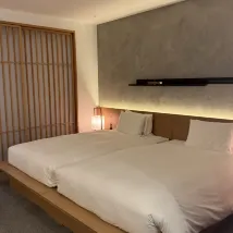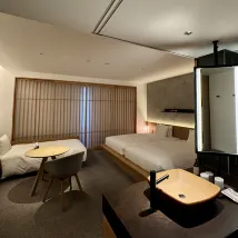 라운드 욕조 룸을 예약했습니다. 객실은 잘 디자인되었고 히바 나무 욕조에 몸을 담그며 즐거운 시간을 보냈습니다. 천장에 반사되는 예쁜 물빛을 즐기며 스트레스를 날려버렸습니다. 샴푸/바디워시의 우디 향이 정말 마음에 들어서 집에 가져갈 병을 하나 샀습니다! 호텔의 전통적인 분위기와 마치야 프런트 데스크도 정말 마음에 들었습니다. 가장 가까운 지하철역(가라스마 오이케)까지 걸어서 5~7분(거의 2~3개 교차로)이 이 아름다운 호텔에 온 보람이 있었습니다. 다시 방문해서 머물 것입니다!