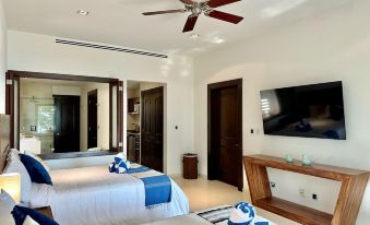 Villa 8 has two independent entry doors: one to the main villa and another one for the adjacent suite, both connected through a middle door. The Villa as a whole has all the necessary amenities for a big family (8 persons max). Ample bathrooms (2) with shower and jacuzzi (2), closet space, two queen size beds per bedroom and a big 55 inch TV to enjoy a movie night!