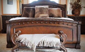 King sized bed with seating bench at the foot of the bed, office desk/makeup area with stool seating, 6 drawer dresser, 2 bedside tables with drawers, 2 full length mirrors, large walk-in closet, outdoor patio via sliding glass doors with matching Adirondack chairs to relax and enjoy the mountain air. Master bathroom has a standup shower and oversized soaking tub with a private toilet area and double sink vanity with a side linen closet. There is a roll-away bed stored in the closet that is available.