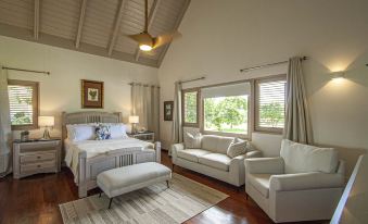 The home has 4 bedrooms with 4.5 bathrooms. One queen bed in master bedroom, one king bed in second bedroom and in room 3 and 4 each one has 2 queen size beds. All four bedrooms have air conditioning, ceiling fans, Smart TVs, safe deposit boxes and full bathrooms. The studio, as well, has air conditioning, a 65" Smart TV. The living room has a 30 ft. high ceiling, hosts 2 dining tables that each seats 12; and opens up with six wooden sliding doors, to a view over the deck and swimming pool, towards the golf course. The gazebo is located between the pool and indoor courtyard with a living area and a dining table that seats ten, facing the green of the 10th hole.