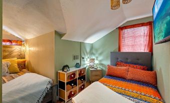 Ascend the stairs to discover two thoughtfully designed bedrooms full of Bohemian aesthetics and mood-setting vibes with fairy lights. Each room features a luxurious Memory Foam queen-size bed (with USB plugs) and a twin-size bed, accompanied by Roku TVs to cater to your tech-savvy desires.