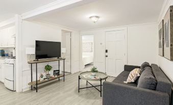 As you enter the apartment, you will walk right into an open-concept living room with a sofa that can pull out into a queen-sized bed, a circular coffee table, and a SmartTV to log in to your streaming apps like Netflix, Hulu, Disney+, and PrimeTV.