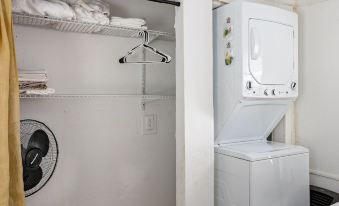 One of the two bedrooms is immediately to your right as you enter. This bedroom offers a queen-sized bed, a closet to hang your clothing, and a washer/dryer available to use.