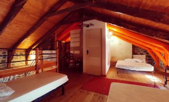 -in the 2nd floor, common space under the roof, 2 140 cm more intimate corner beds, and 4 single beds. a bathroom with WC