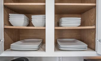 - Fully Equipped Kitchen stocked with basics (plates, utensils, drink ware, baking pans, pots and pans, air fryer, toaster, seasonings, etc)