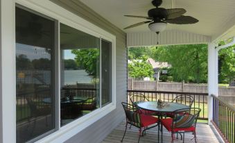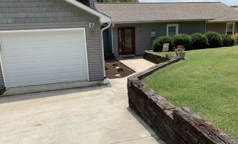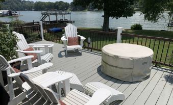 Lake house has a covered porch that is 47 feet long looking out to the water. Covered porch has ceiling fans with spacious seating and has a gas grill and an electric smoker available for your use. Lower deck is one step down and is a 12 by 22 sun deck adjacent to the covered porch with additional seating and a gas fire-pit with polished glass embers. Great for a chilly night! Lower deck has 5 steps to the grassy yard and it is level from there to the water. Alternate route by the garage will bring you from the house to the water with no steps!