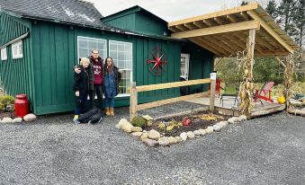Inside, you'll find a comfortable bedroom with a queen bed, featuring a headboard made from the original barn door. The open living room and kitchen area include a pull-out queen couch, smart TV, corner desk, and high-speed Wi-Fi.