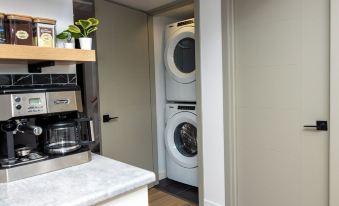 Enjoy a fully equipped kitchen with a fridge/freezer combo, over-the-range microwave, full range with oven, wide sink, a De'Longhi Coffee & Espresso maker, and a dishwasher. Complimentary sweet bundle, Coffee and hot chocolate and spices are also included.