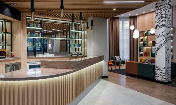 Equipped with tables, comfortable sofas and armchairs, the lobby will be a great place to work in a light, relaxed atmosphere. The equipped bar will allow you to enjoy relaxation and panoramic views of the central square of the park hotel.