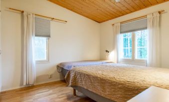 Well-equipped and spacious wooden cabin with boarded outer walls (2004), spacious living room (sofa bed 140x200 cm, bed for two) and living room/kitchen with well-equipped kitchen facilities. Two bedrooms, bedroom 1: three beds, bedroom 2: three beds. Separate WC, washroom with two showers, sauna (wood-burning sauna stove). There is a carport in the yard.