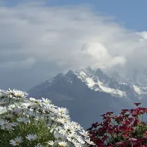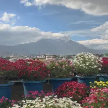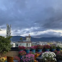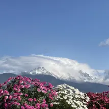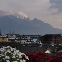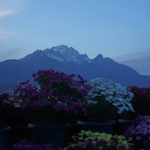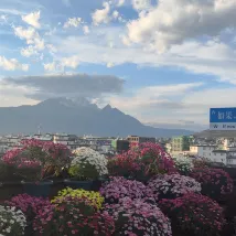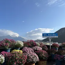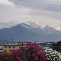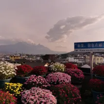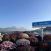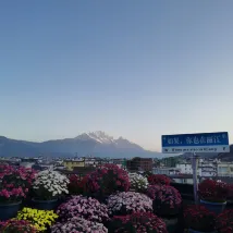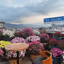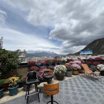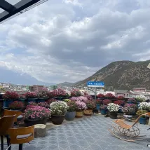 옥룡설산을 바라볼 수 있는 6층 테라스에는 꽃들이 많이 피어 있어 설산 사진을 찍을 수 있도록 세심하게 신경썼습니다. 테라스.