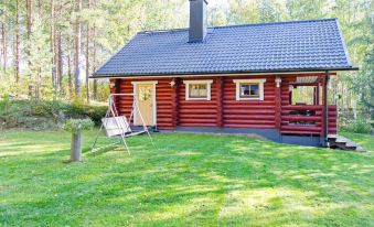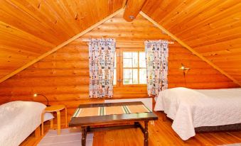 Log cabin 1992, living room/kitchen, sleeping alcove (curtain) double bed (140 cm). On the upper floor (no door) two sleeping areas separated by curtain. One with double bed (160 cm) and other with 3 beds (2 x 90 cm and 1 x 80 cm). Wood-heated sauna, washroom. Entrance to the sauna, washroom and WC from terrace.