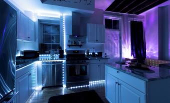 Kitchen: Fully equipped with modern appliances and old-world charm. It is perfect for candlelit dinners. Modern dining with a skyline mural will bring magic to the table. Enjoy tons of provided games, such as Jumbo Jenga, Dice, and Connect Four. This is the place for laughter, excitement, and memories.