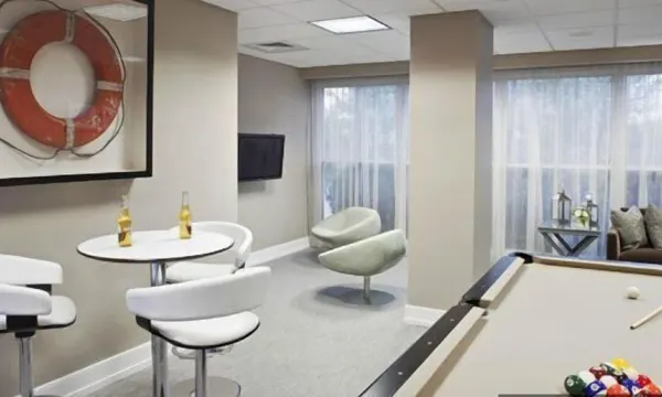 Activity room with large flat-panel TV, fully automated audiovisual entertainment system, pool table, seating areas, video games, classic board and card games, and jukebox