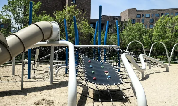 中央草坪鬱鬱葱葱,乾乾淨淨。路邊有狗屎清潔袋,使用方便。