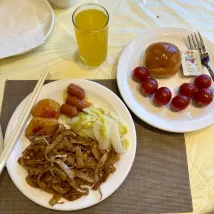토스트, 게란후라이,찐계란,만두,(딤섬아님),스프,샐러드.과일, 차,커피,시리얼 등